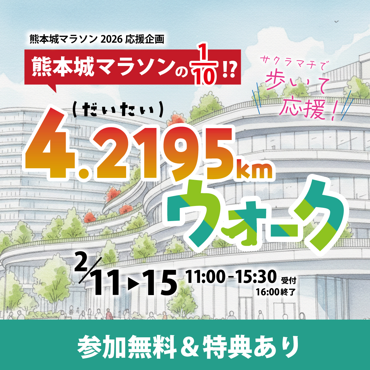 EVENT アミュサクグルメ発掘祭 2026.01.16(金) ~ 2026.02.23(月) 館内各所 Information by SAKURA MACHI Kumamoto 詳しく見る EVENT 葬送のフリーレン in Kumamoto 2026.01.16(金) ~ 2026.03.08(日) 2F 特設会場 Information by SAKURA MACHI Kumamoto 詳しく見る NEWS 映画を1,000円で楽しめる!TOHOシネマズ×サクラマチカードキャンペーン Information by サクラマチカードカウンター 詳しく見る NEWS サクラマチカードのご案内 2025.04.01(火) ~ 2026.03.31(火) Information by SAKURA MACHI Kumamoto 詳しく見る 1/ ショップニュース イベント ショップガイド フロアマップ TOHOシネマズ 施設案内・サービス サクラマチカード NEWS ショップの最新情報をお届けします カテゴリ別に見る お知らせ 新商品 おすすめ商品 期間限定 イベント・キャンペーン 2026.02.04|お知らせ 【CROWNGardenex】花束ご予約受付中 view more 2026.02.04|お知らせ ハニーズFINAL SALE開催中! view more 2026.02.04|お知らせ お得なドリンクセット view more 2026.02.04|新商品 桜町熊本城前店 【期間限定】昨年人気の「ちょこぷりん」がさらにおいしく進化して再登場! view more 2026.02.04|イベント・キャンペーン 【募集中 】荒川DANCE FESイベント✨ view more 2026.02.03|新商品 ランニングに最適な新作シューズが入荷しました view more 2026.02.03|お知らせ 【恵方巻!】フードウェイチラシ view more 2026.02.03|イベント・キャンペーン 2月【逆上がり練習会】【跳び箱練習会】募集開始! view more 2026.02.02|イベント・キャンペーン 【会員募集中】2月入会キャンペーン!! view more もっと見る EVENT サクラマチで開催するイベントをご案内します もっと見る 2026.01.16FRI-2026.02.23MON アミュサクグルメ発掘祭 館内各所 view more 2026.01.16FRI-2026.03.08SUN 葬送のフリーレン in Kumamoto 2F 特設会場 view more 2026.02.11WED-2026.02.15SUN 熊本城マラソン2026応援企画 (だいたい)4.2195㎞ウォーク view more 2026.02.21SAT-2026.02.23MON SAKURA MACHI Kumamotoでピカチュウに会える view more 2026.01.30FRI-2026.07.31FRI 『アイドルマスター』シリーズ 20th Anniversary パネルオファープロジェクト「オファマス」 view more 2026.01.30FRI-2026.02.15SUN 名作絵本のクッキー缶セレクション by Cake.jp サクラマチスクエア前 view more 2026.01.30FRI-2026.02.15SUN パイ専門店feal ポップアップショップ view more 2025.09.13SAT-2026.09.30WED ARで楽しもう!くまモン大変身 5F/キッズテラス view more 2026.01.18SUN-2026.01.31SAT サクラマチの夜 施設外観 view more もっと見る SAKURAMACHI GARDEN サクラマチのおすすめスポットをご紹介 屋上階に上がると、熊本城を臨む広々とした緑溢れる空間が現れます。子供が遊べるエリアにはまっ白なすべり台、カフェスペースでほっと一息、イベントスペースではアクティビティやエンタメなどを楽しめるスペースもあります。庭園エリアには『おもてなしの庭』として日本の四季を五感すべてで感じられる仕掛けを施してあります。 もっと見る SHOP GUIDE ショップ検索 / フロアマップ もっと見る ショップ検索 フロアマップ キーワードで検索する カテゴリから探す レディース メンズ グルメ カフェ エンターテイメント 小物/バック/コスメ 生活雑貨 サービス PARKING 駐車場詳細 アクセス 駐車場・アクセスのご案内 サクラマチ熊本駐車場 サクラマチ熊本駐車場 サクラマチクマモト駐車場では、お買い上げ金額に応じた無料の割引サービスがございます。詳しくは、無料駐車サービスのご案内をご覧ください。※一部対象外店舗あり ※無料駐車サービスについては「駐車場詳細」をご覧ください。 平日 土日祝 8-22時 最初の1時間 300円 400円 以後30分毎 100円 150円 最大料金 1,000円 1,200円 INFORMATION サクラマチクマモトからのお知らせ もっと見る 現在、お知らせはありません。 もっと見る INSTAGRAM 最新情報をチェック! 🥧✨ 本物のパイを、世界へ。 パイ専門店fealのポップアップショップが 期間限定でサクラマチに登場 📱✨ 充電が少なくなっても安心! モバイルバッテリーのレンタルサービス【CHARGESPOT(チャー 🍫 バレンタインや自分用に、 ちょっと特別なチョコスイーツを🍫✨ B1F ケンズカフェ東京の「特撰 🪄 \ついに登場!葬送のフリーレンコラボ/ 2月3日(火)より、熊本限定のお菓子2商品が新発売✨ 🌸 「葬送のフリーレン in Kumamoto」より、 ポップアップショップの様子をお届けします✨ 🌸 2F サックスバーでは、 吉田カバン90周年商品を展開中! POTRから新作「RIDE BLA 🌸 2F サックスバーでは、 吉田カバン90周年商品を展開中! POTRから新作「RIDE BLA 🌸 2F サックスバーでは、 吉田カバン90周年商品を展開中! POTRから新作「RIDE BLA 🍫💝 B1Fベルギーワッフル マネケンより、 ショコラあふれる期間限定ワッフルをご紹介!👀✨ 今回 🥧✨ 本物のパイを、世界へ。 パイ専門店fealのポップアップショップが 期間限定でサクラマチに登場 📱✨ 充電が少なくなっても安心! モバイルバッテリーのレンタルサービス【CHARGESPOT(チャー 🍫 バレンタインや自分用に、 ちょっと特別なチョコスイーツを🍫✨ B1F ケンズカフェ東京の「特撰 🪄 \ついに登場!葬送のフリーレンコラボ/ 2月3日(火)より、熊本限