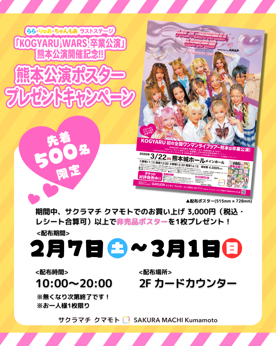 EVENT アミュサクグルメ発掘祭 2026.01.16(金) ~ 2026.02.23(月) 館内各所 Information by SAKURA MACHI Kumamoto 詳しく見る EVENT 葬送のフリーレン in Kumamoto 2026.01.16(金) ~ 2026.03.08(日) 2F 特設会場 Information by SAKURA MACHI Kumamoto 詳しく見る NEWS 映画を1,000円で楽しめる!TOHOシネマズ×サクラマチカードキャンペーン Information by サクラマチカードカウンター 詳しく見る NEWS サクラマチカードのご案内 2025.04.01(火) ~ 2026.03.31(火) Information by SAKURA MACHI Kumamoto 詳しく見る 1/ ショップニュース イベント ショップガイド フロアマップ TOHOシネマズ 施設案内・サービス サクラマチカード NEWS ショップの最新情報をお届けします カテゴリ別に見る お知らせ 新商品 おすすめ商品 期間限定 イベント・キャンペーン 2026.02.06|お知らせ UNDER ARMOUR 新作ランニングシューズ view more 2026.02.06|お知らせ 【バスツアー】アニメ「葬送のフリーレン」ラッピングバスで行く石段と石橋の郷、熊本美里町1kgハンバーグとプリンのランチ付 view more 2026.02.06|イベント・キャンペーン 眼鏡のZoffでは、2本目から10%OFFを開催中!! view more 2026.02.06|お知らせ フォーマルウェアを自分サイズに! view more 2026.02.06|お知らせ 【開催中】オーダースーツSPECIAL SALE view more 2026.02.06|イベント・キャンペーン 【募集開始!】シンギングボウルで音浴ヨガ✨ view more 2026.02.06|お知らせ フォーマルウェアを自分サイズに! view more 2026.02.05|イベント・キャンペーン 【募集中】HOTアロマヨガイベント✨ view more 2026.02.04|お知らせ 【CROWNGardenex】花束ご予約受付中 view more もっと見る EVENT サクラマチで開催するイベントをご案内します もっと見る 2026.01.16FRI-2026.02.23MON アミュサクグルメ発掘祭 館内各所 view more 2026.01.16FRI-2026.03.08SUN 葬送のフリーレン in Kumamoto 2F 特設会場 view more 2026.02.07SAT-2026.03.01SUN 【KOGYARU WARS】熊本公演開催記念!ポスタープレゼントキャンペーン view more 2026.02.11WED-2026.02.17TUE 台湾サンダル『小部本舗』POP UP SHOP 1F/メインエントランス view more 2026.02.05THU-2026.05.31SUN 【お知らせ】プレミアム付商品券発売について view more 2026.02.11WED-2026.02.15SUN 熊本城マラソン2026応援企画 (だいたい)4.2195㎞ウォーク view more 2026.02.21SAT-2026.02.23MON SAKURA MACHI Kumamotoでピカチュウに会える view more 2026.01.30FRI-2026.07.31FRI 『アイドルマスター』シリーズ 20th Anniversary パネルオファープロジェクト「オファマス」 view more 2026.01.30FRI-2026.02.15SUN 名作絵本のクッキー缶セレクション by Cake.jp サクラマチスクエア前 view more もっと見る SAKURAMACHI GARDEN サクラマチのおすすめスポットをご紹介 屋上階に上がると、熊本城を臨む広々とした緑溢れる空間が現れます。子供が遊べるエリアにはまっ白なすべり台、カフェスペースでほっと一息、イベントスペースではアクティビティやエンタメなどを楽しめるスペースもあります。庭園エリアには『おもてなしの庭』として日本の四季を五感すべてで感じられる仕掛けを施してあります。 もっと見る SHOP GUIDE ショップ検索 / フロアマップ もっと見る ショップ検索 フロアマップ キーワードで検索する カテゴリから探す レディース メンズ グルメ カフェ エンターテイメント 小物/バック/コスメ 生活雑貨 サービス PARKING 駐車場詳細 アクセス 駐車場・アクセスのご案内 サクラマチ熊本駐車場 サクラマチ熊本駐車場 サクラマチクマモト駐車場では、お買い上げ金額に応じた無料の割引サービスがございます。詳しくは、無料駐車サービスのご案内をご覧ください。※一部対象外店舗あり ※無料駐車サービスについては「駐車場詳細」をご覧ください。 平日 土日祝 8-22時 最初の1時間 300円 400円 以後30分毎 100円 150円 最大料金 1,000円 1,200円 INFORMATION サクラマチクマモトからのお知らせ もっと見る 現在、お知らせはありません。 もっと見る INSTAGRAM 最新情報をチェック! 🏯🚶♀️🚶♂️🚶 熊本城マラソン2026 応援企画! \\ 熊本城マラソンの1/10!?// 📸✨ 地下一階の韓国発セルフフォトスタジオ photoism(フォトイズム)をご紹介します🤍 プロ 🏃 1F THE NORTH FACEより、 新作アイテムのお知らせです👟✨ NF02504 アル 💍✨ 2F THE KISSより、 きらりときめく新作ジュエリーが届きました👀✨ 繊細なダブルチェ 🌸 冬のサクラマチガーデンは どの植物も春に向けてつぼみをつける中、 ピンクの山茶花が元気いっぱいに 🥧✨ 本物のパイを、世界へ。 パイ専門店fealのポップアップショップが 期間限定でサクラマチに登場 📱✨ 充電が少なくなっても安心! モバイルバッテリーのレンタルサービス【CHARGESPOT(チャー 🍫 バレンタインや自分用に、 ちょっと特別なチョコスイーツを🍫✨ B1F ケンズカフェ東京の「特撰 🪄 \ついに登場!葬送のフリーレンコラボ/ 2月3日(火)より、熊本限定のお菓子2商品が新発売✨ 🏯🚶♀️🚶♂️🚶 熊本城マラソン2026 応援企画! \\ 熊本城マラソンの1/10!?// 📸✨ 地下一階の韓国発セルフフォトスタジオ photoism(フォトイズム)をご紹介します🤍 プロ 🏃 1F THE NORTH FACEより、 新作アイテムのお知らせです👟✨ NF02504 ア