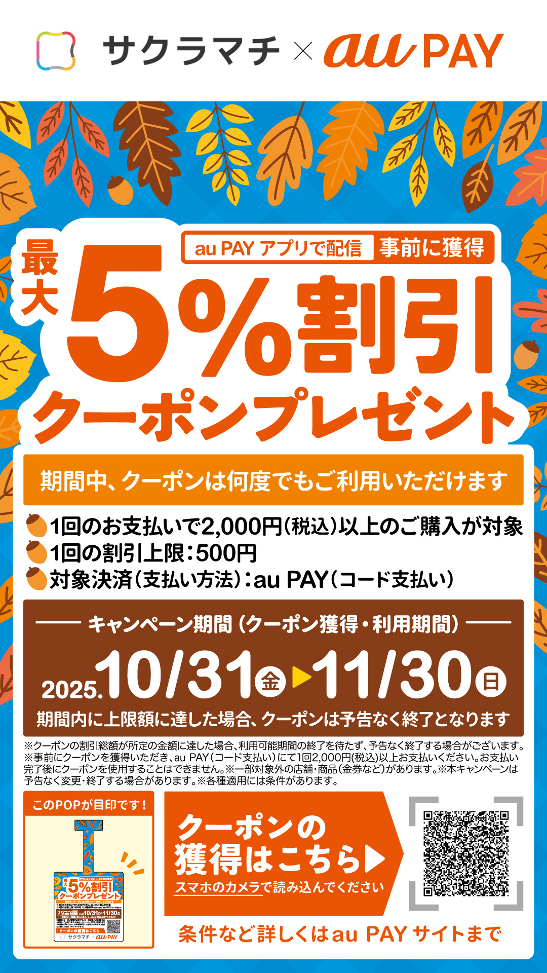 10月31日から!サクラマチ×auPAY「最大5%割引クーポンプレゼント」