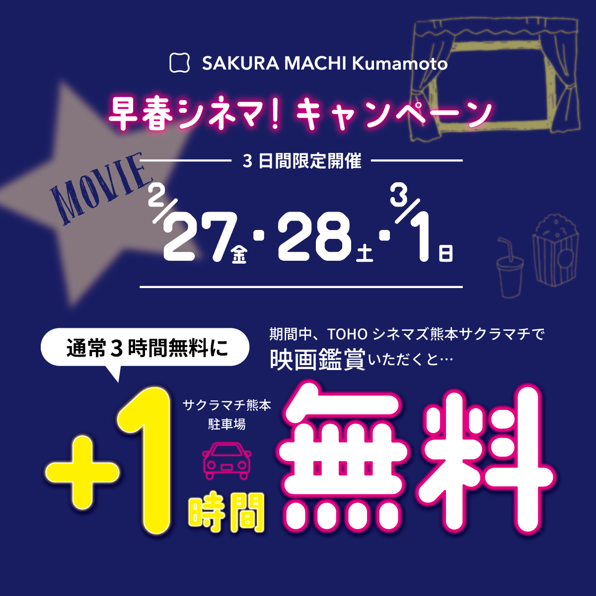 サクラマチ クマモトではTOHOシネマズ熊本サクラマチで映画鑑賞いただくと、3日間の期間限定駐車料金割引を実施いたします。
