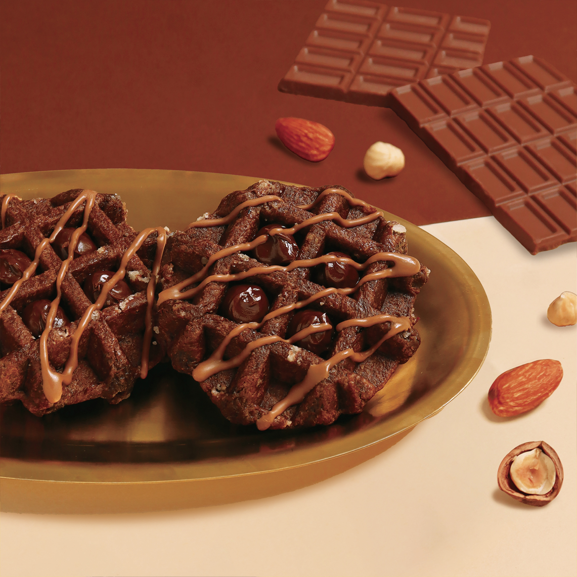 生地はベルギーチョコチップとココアパウダー、スイートチョコレートを練り込み口どけの良い濃厚な味わいに仕上げました。さらに香り高いヘーゼルナッツとアーモンドが香るチョコレートスプレッドを格子状に絞り、コクのあるキャラメルチョコレートコーチングで華やかに仕上げました。