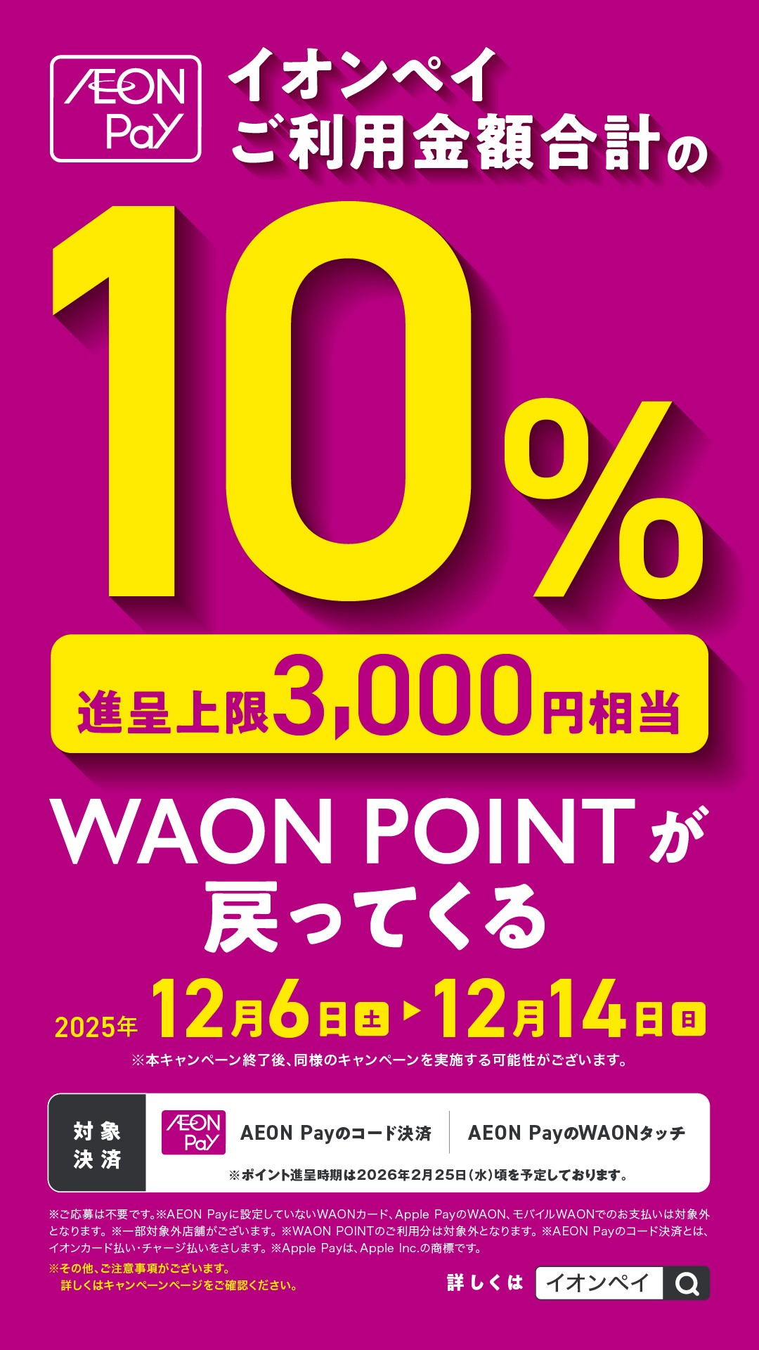 期間中、AEON Pay「ご利用金額の10%WAON POINTが戻ってくる」キャンペーンを開催します。