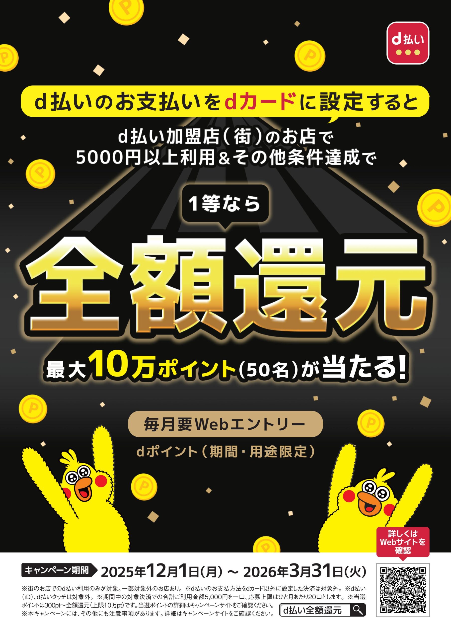 12月1日から!d払い「4カ月連続!最大全額Pt還元!総額2億円分が40万名に当たるキャンペーン」
