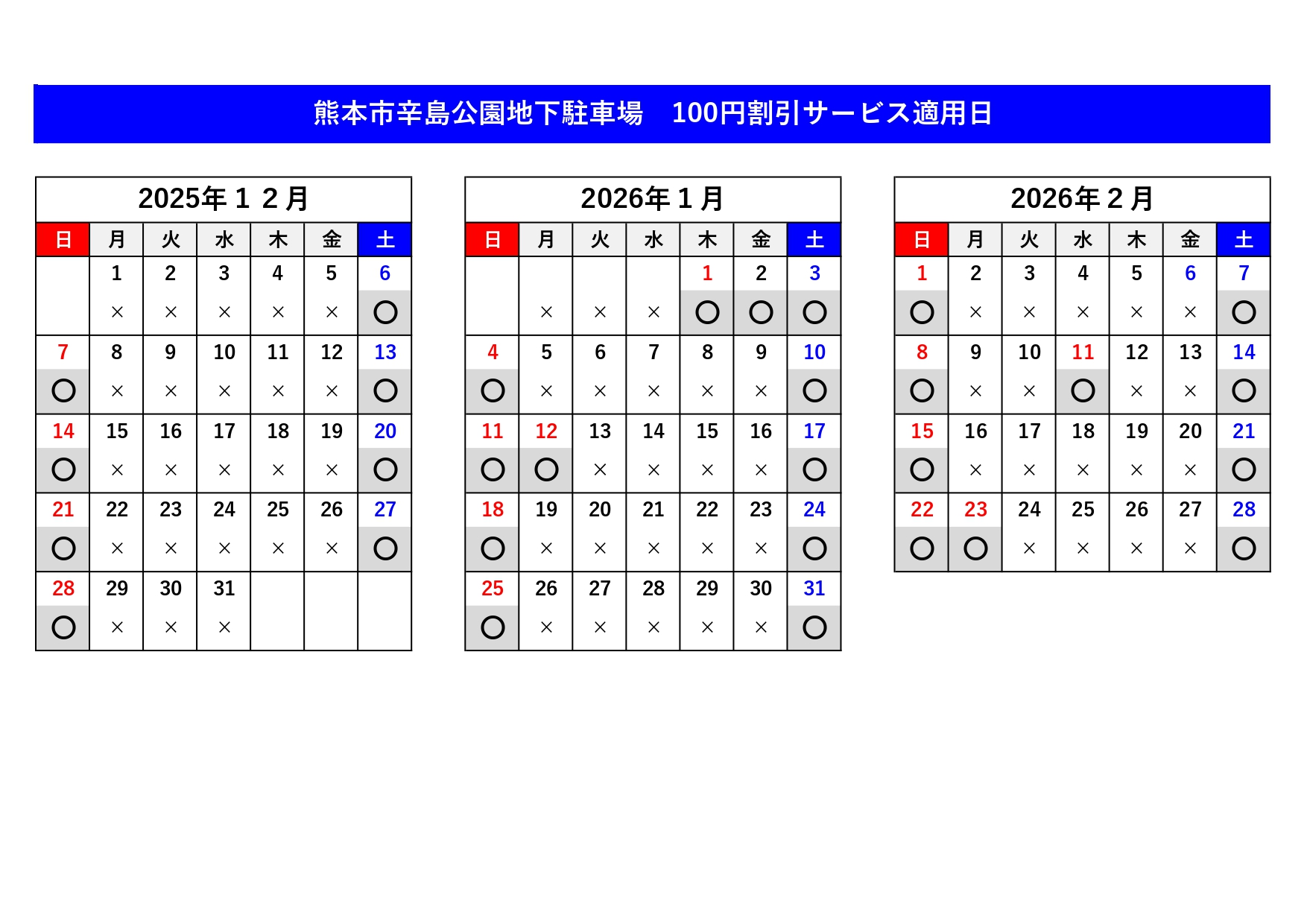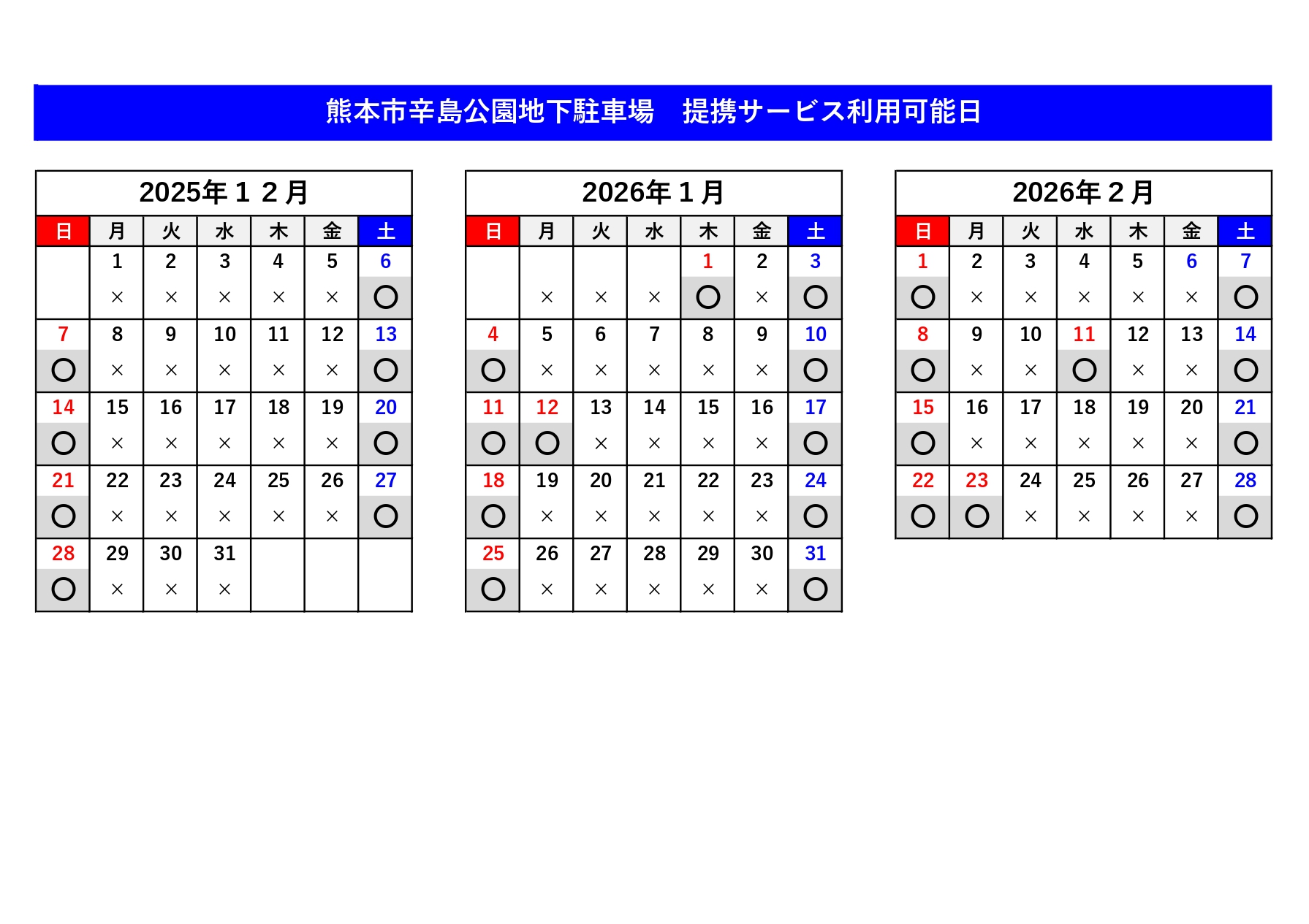 2025年12月6日(土)~2026年2月28日(土)の土日祝限定で、熊本市辛島公園地下駐車場をご利用で、