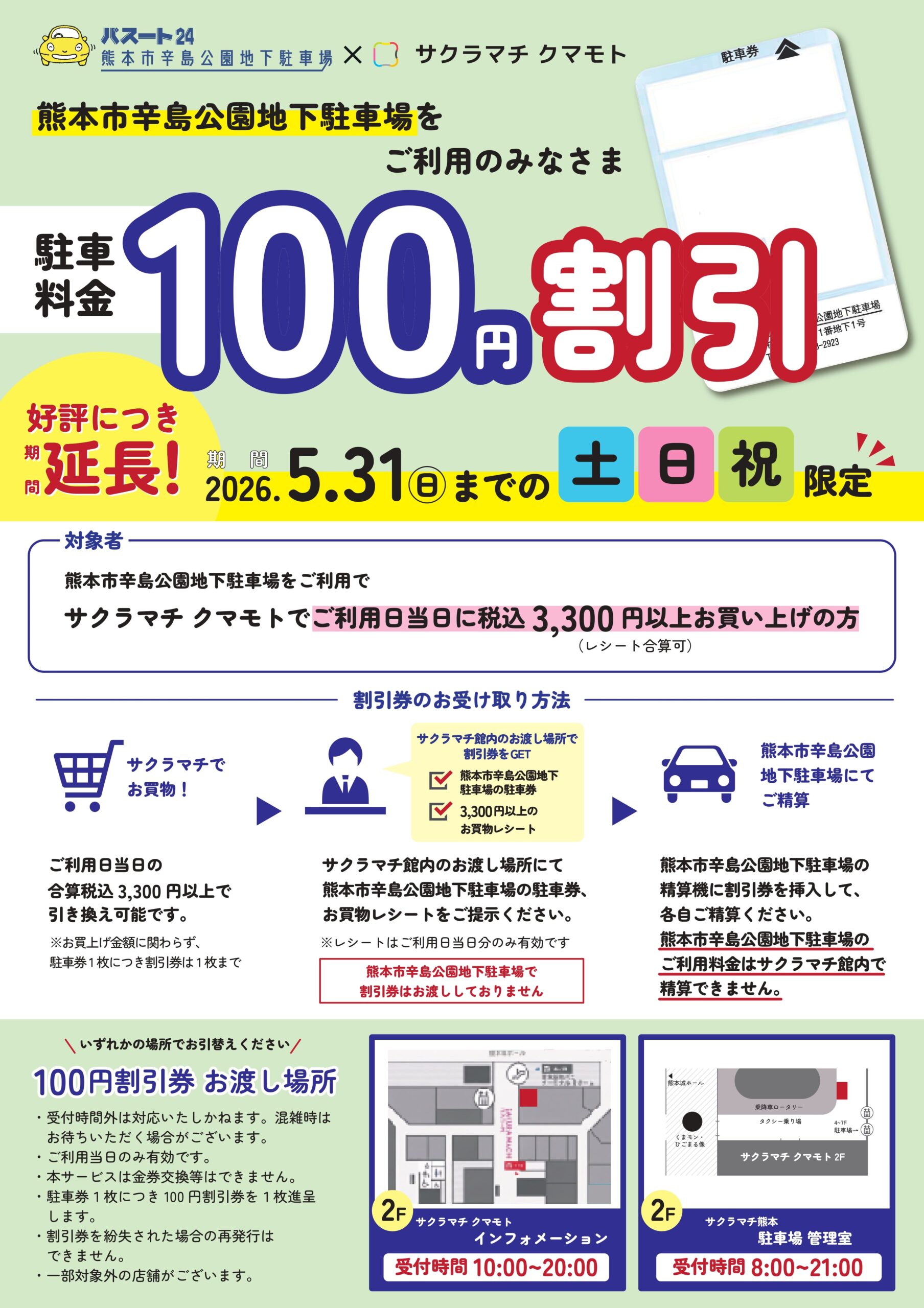 2階インフォメーション又はサクラマチ熊本駐車場 管理室にて100円割引券をお渡しします。