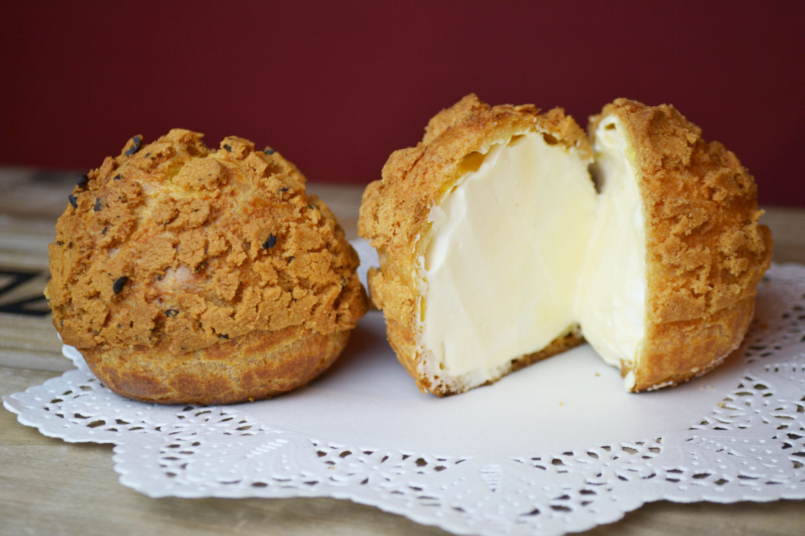 チョコチップのクッキー生地にカスタードがたっぷり入ったウルルシューや季節のシュー詰合せ致します。