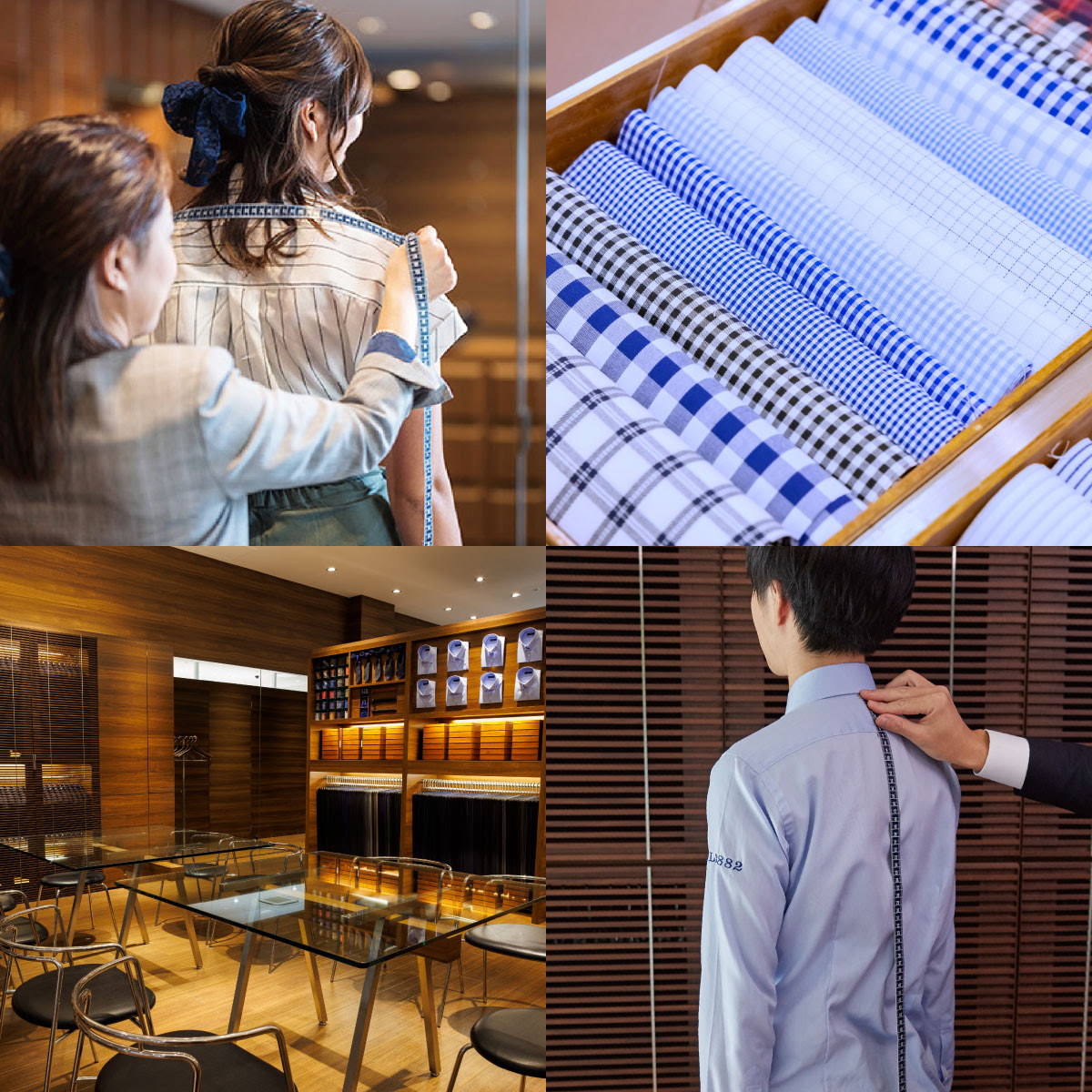 上質なコットン100%や、動きやすいストレッチなどの機能性素材。それらをベースに、襟型やカフス、ポケットの有無まで自分だけの最適解を形づくっていく。