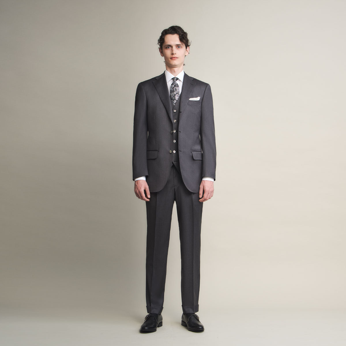 ダークグレーのスーツに共地のベストを合わせた、ストイックなスリーピーススタイリング。