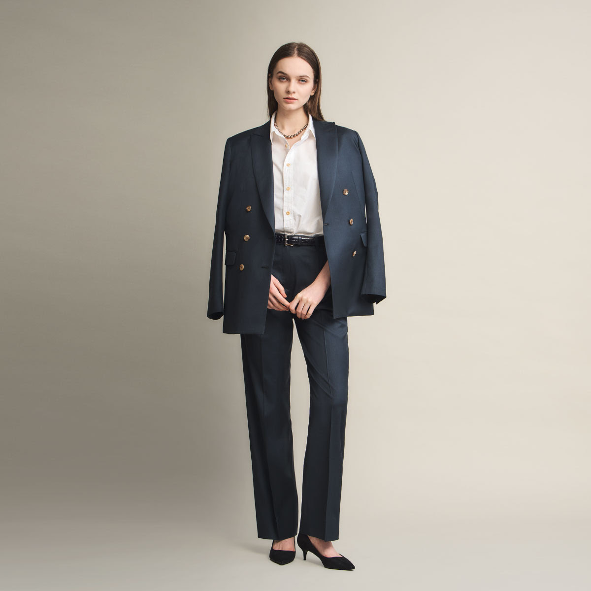 細部まで調整されたシルエットは、ラグジュアリーな素材と相まって、あなたを最も美しく、そして知的に見せる「正解」の一着へと昇華されます。