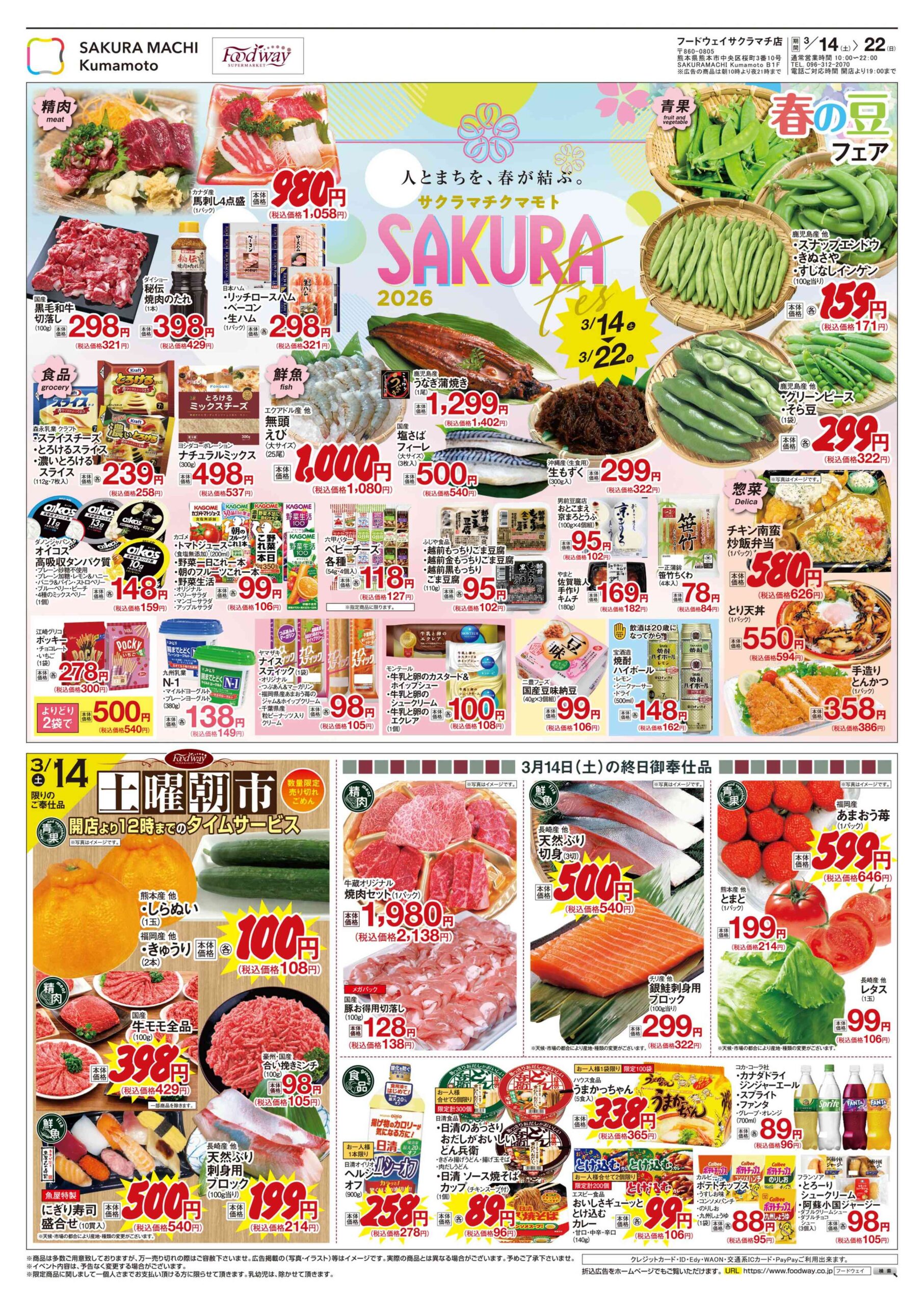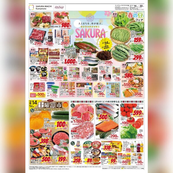TOP / ニュース / フードウェイ今週末のチラシ サクラフェス開催 NEWS ショップの最新情報をお届けします お知らせ フードウェイ今週末のチラシ サクラフェス開催 Food way フードウェイ フードウェイ SHARE SHOP情報を見る PREV前の記事へ 最新ニュース 2026.03.14|お知らせ 【期間限定✨】移籍入会キャンペーン!! view more 2026.03.13|お知らせ SAKURA Fes 2026 view more 2026.03.13|お知らせ 県産いちごのショートケーキクレープ! view more もっと見る カテゴリから探す お知らせ 新商品 おすすめ商品 期間限定 イベント・キャンペーン プレゼント キーワードから探す Zoff キッズスクール キッズ体育 クレープ コンタクトレンズ サクラマチカード サクラマチクマモト シェイプアップ シュークリーム シュークリーム専門店ウルル シル活 シンギングボウル ジム スイーツ スクール ストレス発散 セントラルスポーツ ゾフ ダイエット ダンス デート トレーニング バイク バランスディスク パーソナルトレーニング ピラティス フィットネス フィットネスクラブ フィットネスジム ブライダルジュエリー ボディメイク ボール マット マンツーマン指導 ヨガ レッスン 中央コンタクト 個別指導 機能改善 習い事 自分磨き 苺 跳び箱 鉄棒 音浴ヨガ INFORMATION サクラマチクマモトからのお知らせ もっと見る