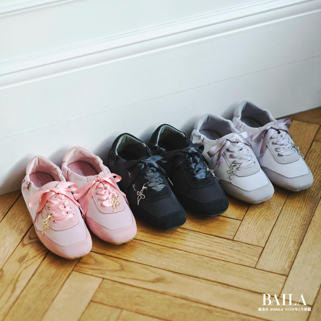 バレエのトゥーシューズのような華奢でフェミニンなデザインの薄底スニーカー。サテン素材のアッパーとリボンモチーフのチャームが、バレエコアやリボンディテールのトレンドをしっかり押さえた1足です。