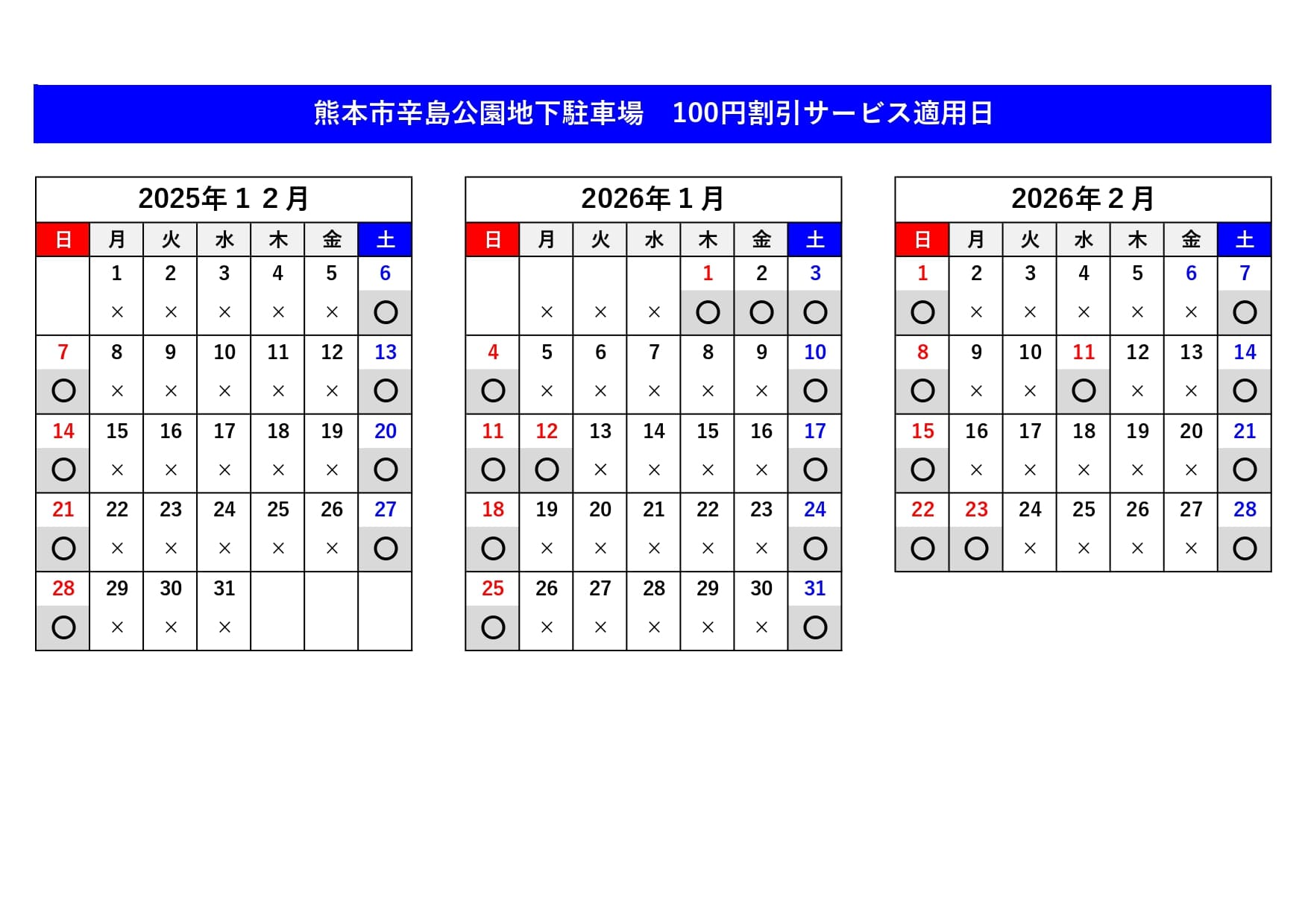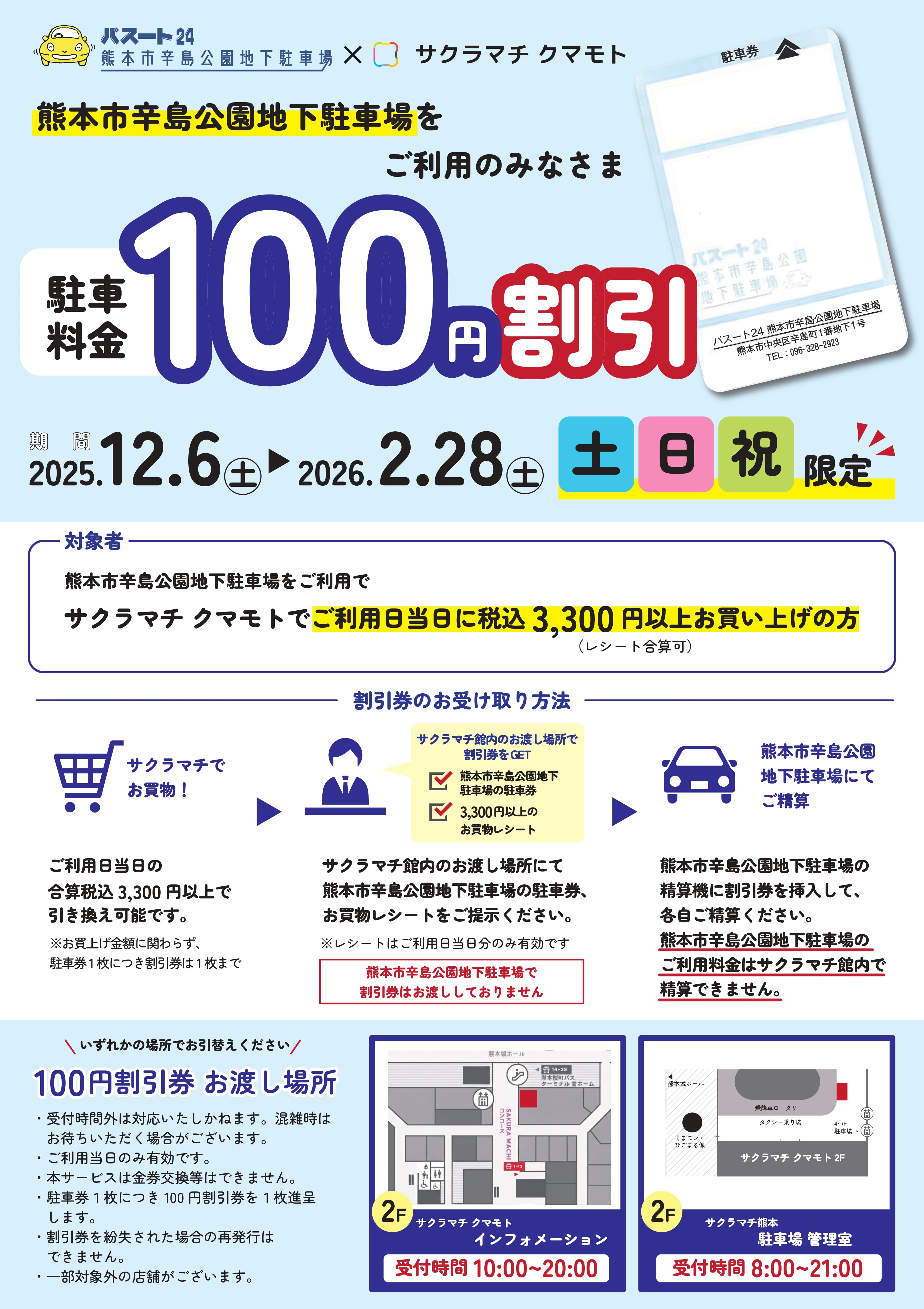 (※)2025年12月6日(土)~2026年2月28日(土)の土日祝限定で、熊本市辛島公園地下駐車場をご利用で、サクラマチ クマモトでご利用当日に税込3,300円以上(レシート合算可)のお買い上げの方には、2階インフォメーション 又は サクラマチ熊本駐車場 管理室にて100円割引券をお渡しします。